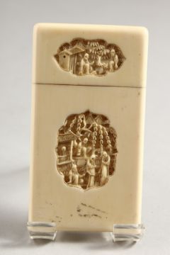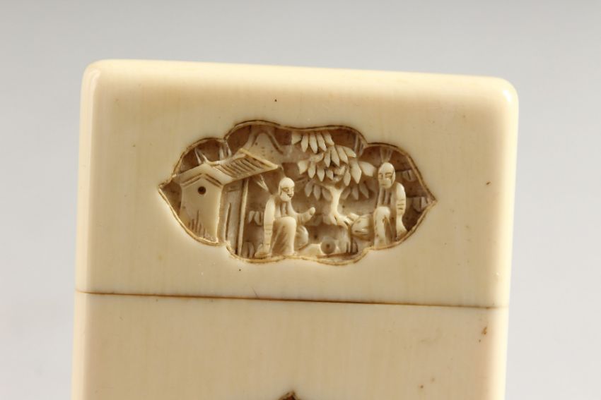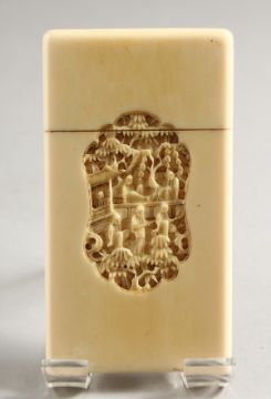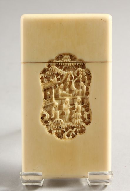 A GOOD CANTON IVORY CALLING CARD CASE carved with figures and trees.