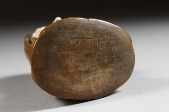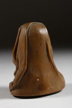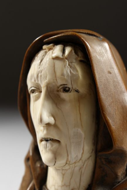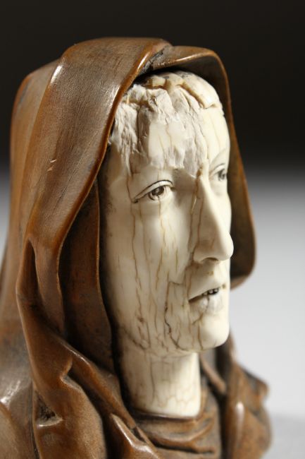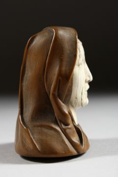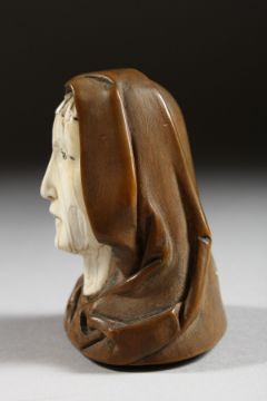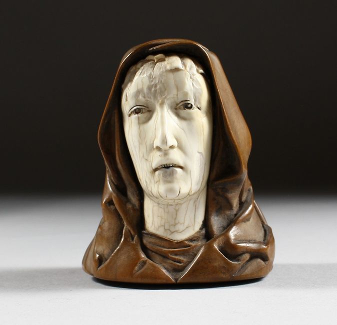 A 19TH-20TH CENTURY EUROPEAN WOOD AND IVORY CARVING, an ivory head with wooden hood.