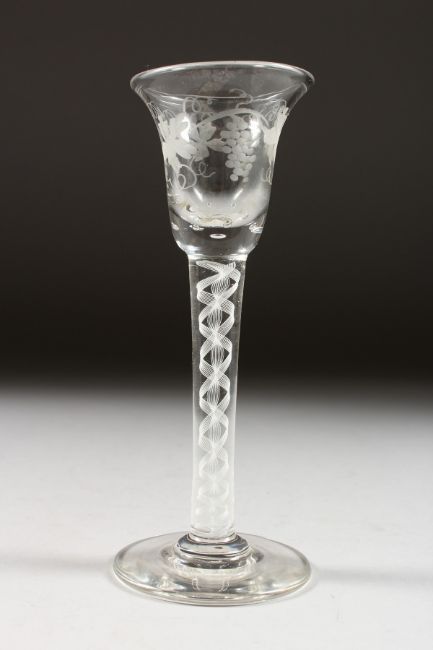 A GEORGIAN WINE GLASS, with inverted bell bowl etched with fruiting vines, with white air twist stem.