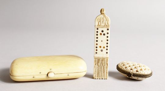 A PLAIN IVORY CIGARETTE CASE, 3.5ins long, a pierced egg shaped box, 1.75ins long, and a BONE TOOTHPICK CASE, A Trifel from Askerne.