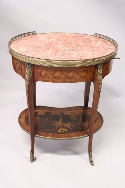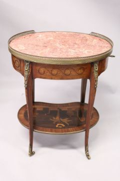 TOPOLINO, ITALY, A GOOD KINGWOOD, ORMOLU AND MARQUETRY OVAL OCCASIONAL TABLE, with brass galleried rouge marble top, over a small pull-out slide, a drawer to each end, with slender legs united by an undertier inlaid with a vase of flowers, bottles and vases.
