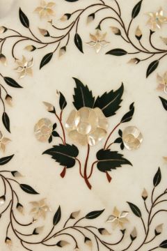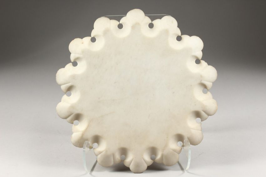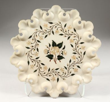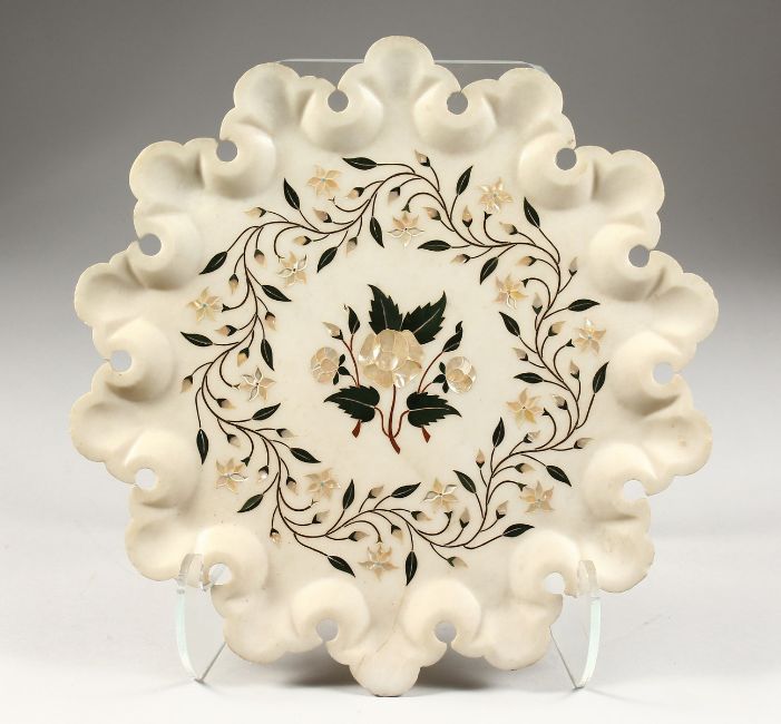 A GOOD INLAID AGRA SHAPED MARBLE TABLE TOP.