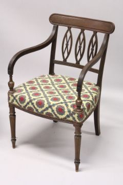A GOOD PAIR OF REGENCY MAHOGANY ARMCHAIRS, with triple pierced oval splats, reeded arms, padded seats and fluted legs.