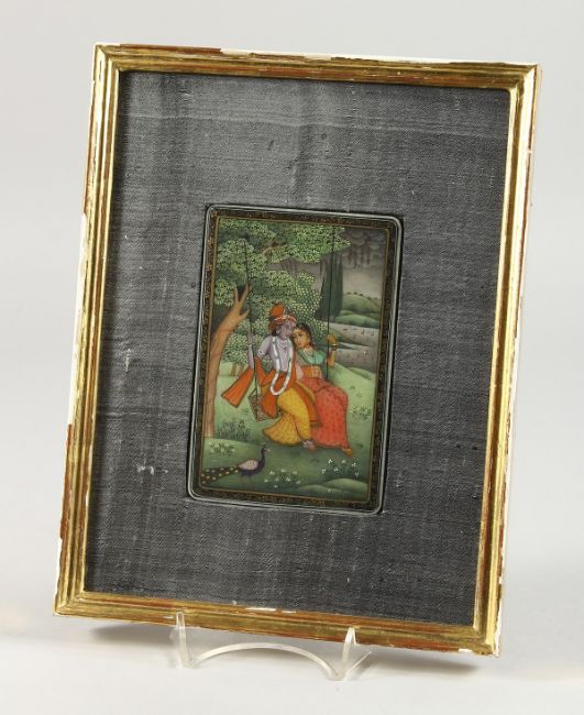 A FRAMED PERSIAN PICTURE, YOUNG LOVERS on a swing.