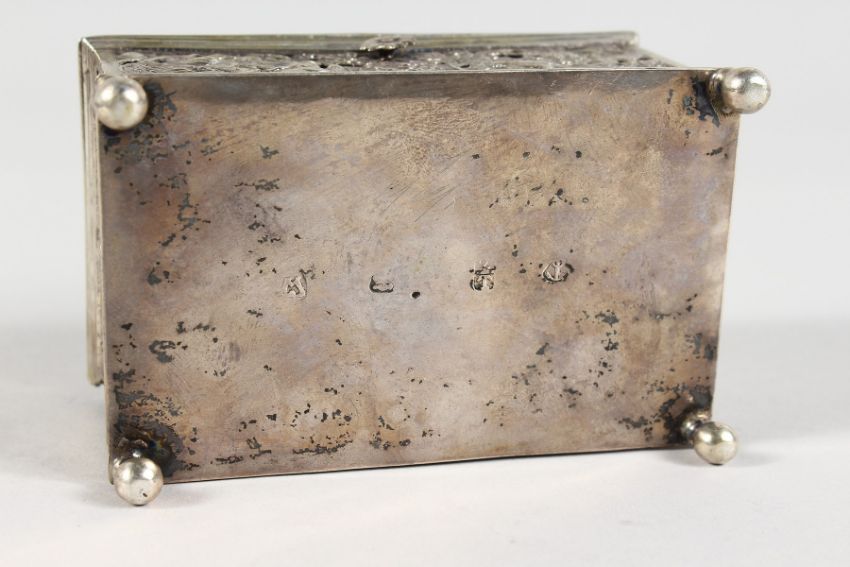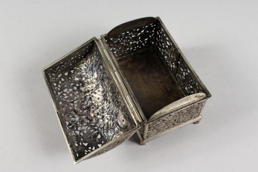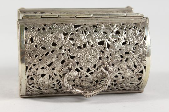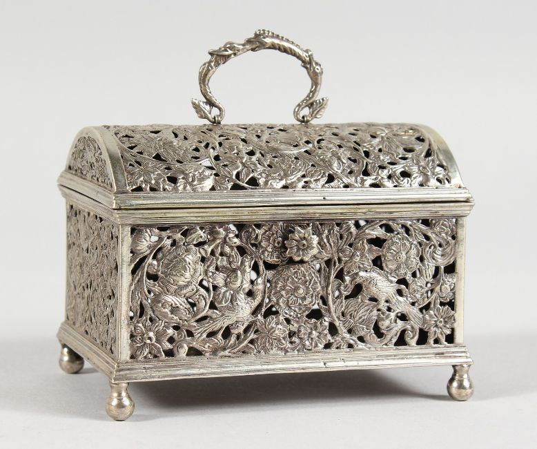 A GOOD DUTCH SILVER DOMED TOP MARRIAGE CASKET, with pierced panels, flowers and birds with swan swing handle, supported on four ball feet.