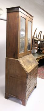 A GOOD GEORGE III MAHOGANY BUREAU BOOKCASE, the upper section with moulded cornice, pair of mirrored doors enclosing shelves, pigeonholes and three small drawers, the base with fall flap, fitted interior with well over four graduated long drawers, on bracket feet.