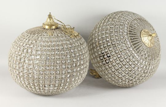 A PAIR OF LARGE BALL SHAPED CUT GLASS AND BRASS CHANDELIERS.