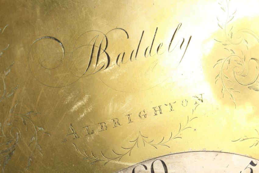AN 18TH CENTURY BRASS WALL SILVERED DIAL CLOCK MOVEMENT by J. BADDELY, ALBRIGHTON, 12-inch dial, eight-day movement striking on a single bell.
