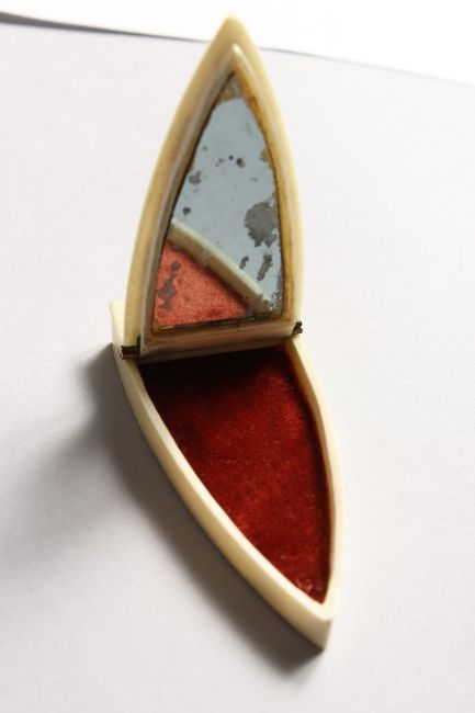 A GEORGE III SHIELD SHAPED IVORY AND TORTOISESHELL PATCH BOX, the lid with silver cartouche, mirror inside and velvet.
