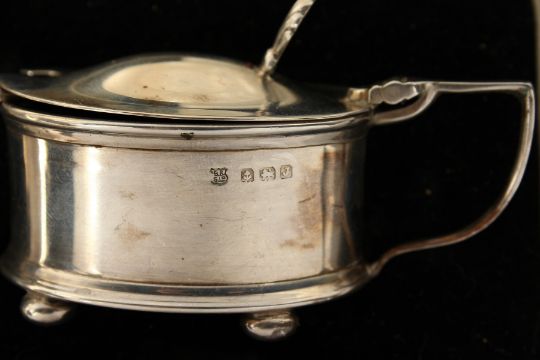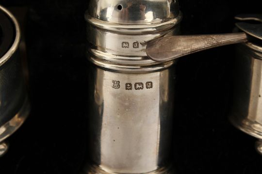 A THREE PIECE SILVER CONDIMENT SET.