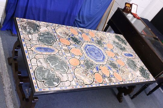 AN IMPRESSIVE 19TH/20TH CENTURY ITALIAN SPECIMEN MARBLE-TOPPED TABLE, inset with coloured stone. 7' 2" long x 3' 11" wide.
