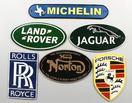 SIX VARIOUS NOVELTY CAST IRON SIGNS, various sizes.