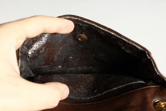 A GOOD CHANEL BROWN LEATHER PADDED PURSE with leather and gilt long handle.