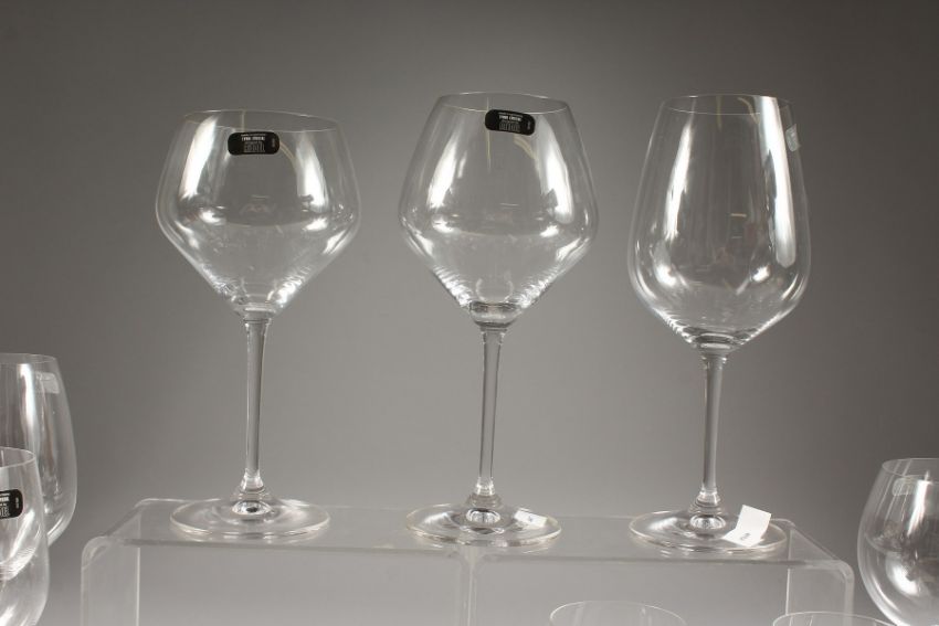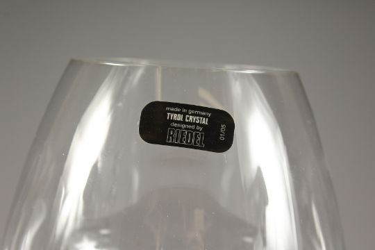 NINE VARIOUS RIEDEL TYROL CRYSTAL GLASSES AND EIGHT TUMBLERS.