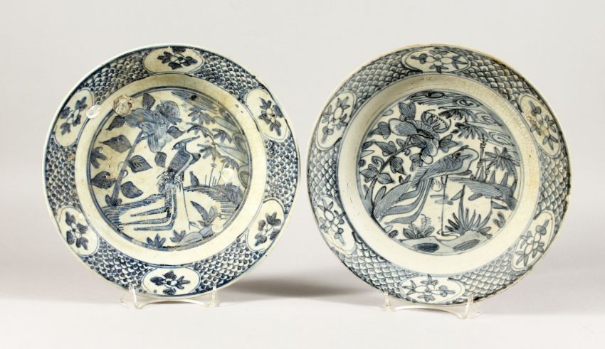 TWO CHINESE WANLI PERIOD BLUE AND WHITE PEACOCK DESIGN PLATES.