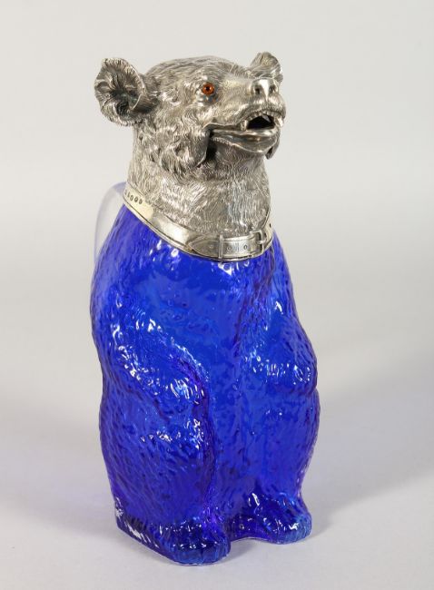 A VERY GOOD BRISTOL BLUE GLASS BEAR CLARET JUG with silver plated head and collar.