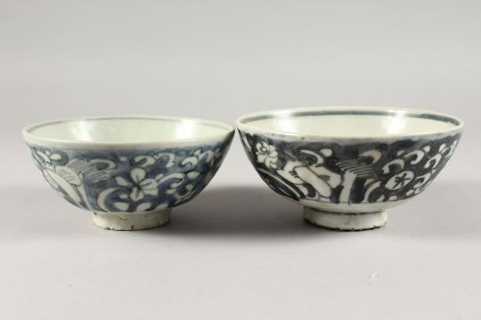 TWO CHINESE KANGXI PERIOD SHIPWRECK BLUE AND WHITE TEA BOWLS.