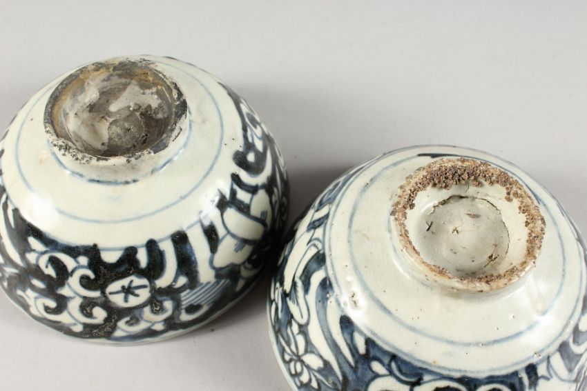 TWO CHINESE KANGXI PERIOD SHIPWRECK BLUE AND WHITE TEA BOWLS.