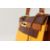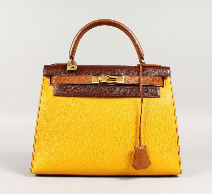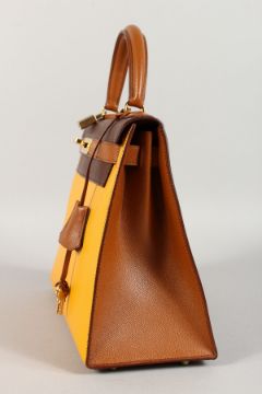 A GOOD HERMES TWO COLOUR LEATHER KELLY BAG, brown and yellow with brass lock. No. 004.