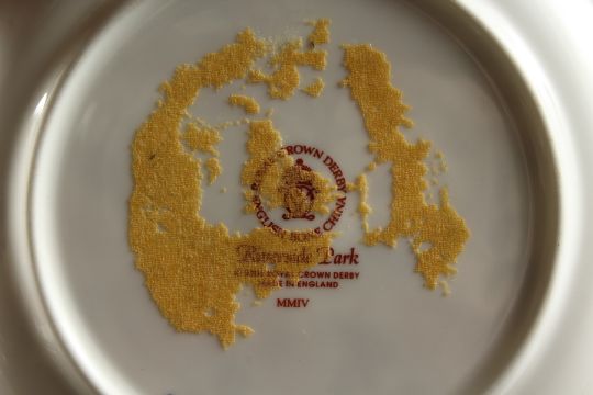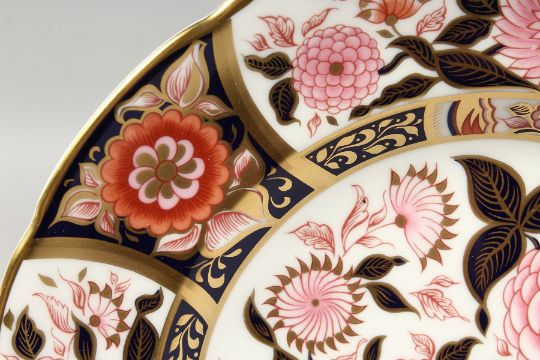 A MODERN SET OF FOUR ROYAL CROWN DERBY coloured Imari style plates and two Abbeydale Imperial plates.