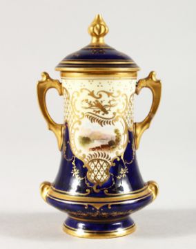 A COALPORT MINIATURE TWO-HANDLED URN AND COVER.