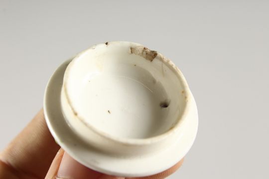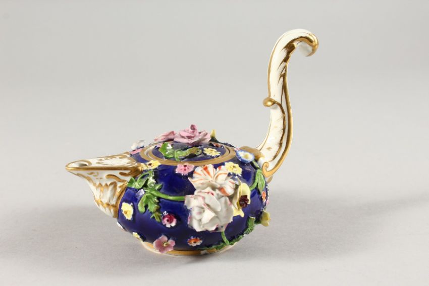 A MINIATURE DERBY FLOWER ENCRUSTED BLUE TEAPOT. 10cm high.