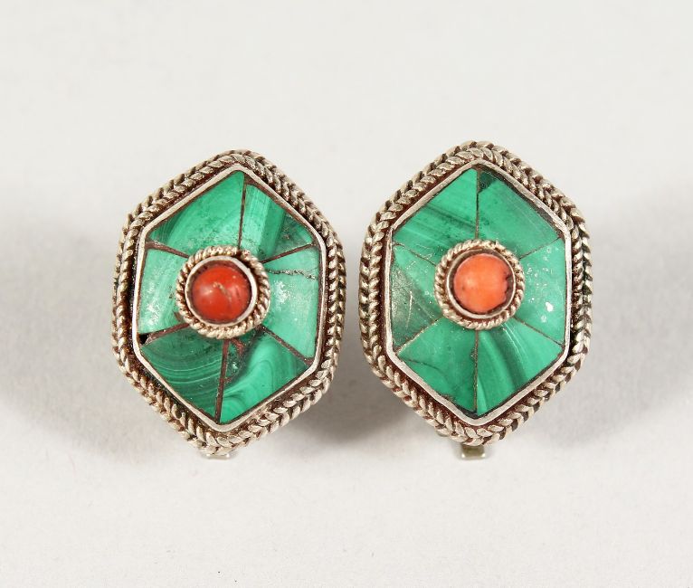 A PAIR OF SILVER AND MALACHITE EAR CLIPS.