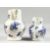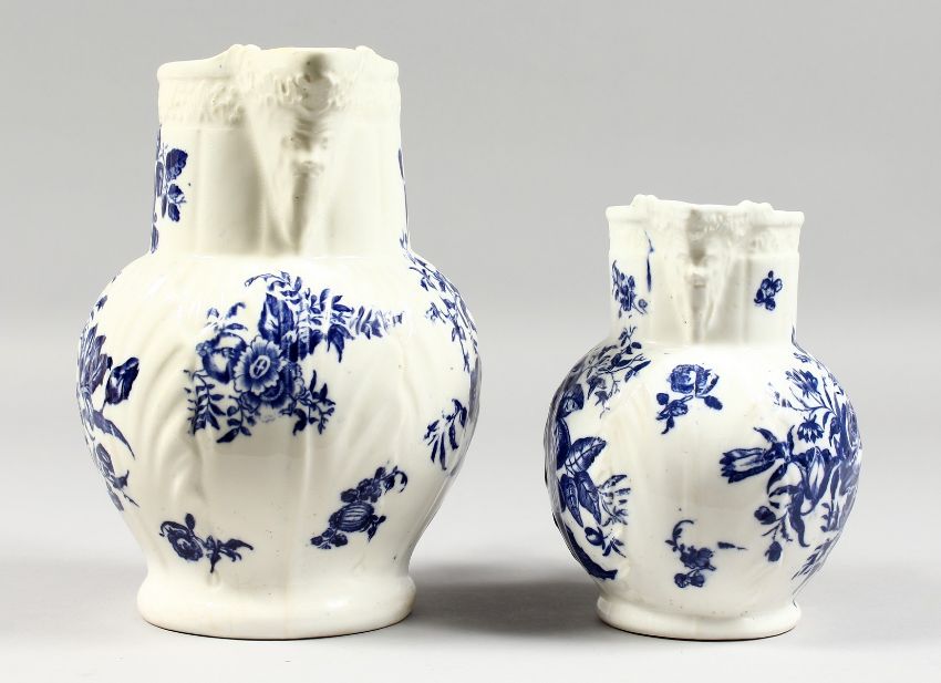 A GRADUATED PAIR OF DECORATIVE ENGLISH PORCELAIN MASK JUGS printed with fir cones and roses in blue.