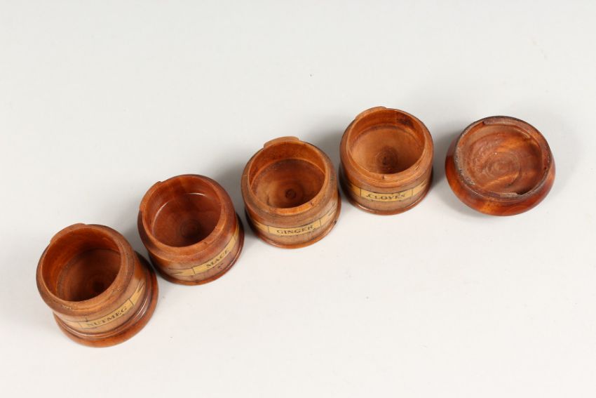 A FOUR-TIER WOOD SPICE TOWER, Cloves, Ginger, Mace and Nutmeg.