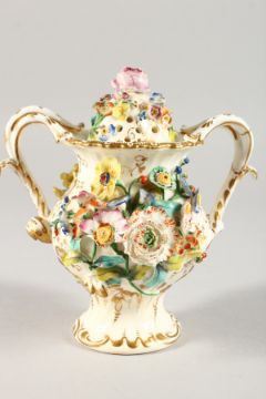 A COALBROOKDALE FLOWER ENCRUSTED TWO-HANDLED VASE AND COVER.