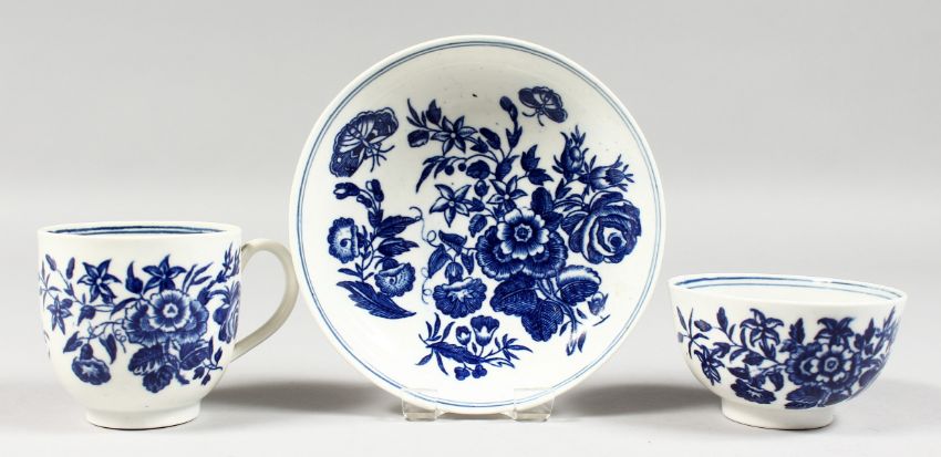 AN 18TH CENTURY WORCESTER COFFEE CUP, TEA BOWL AND SAUCER painted with the three flowers pattern.