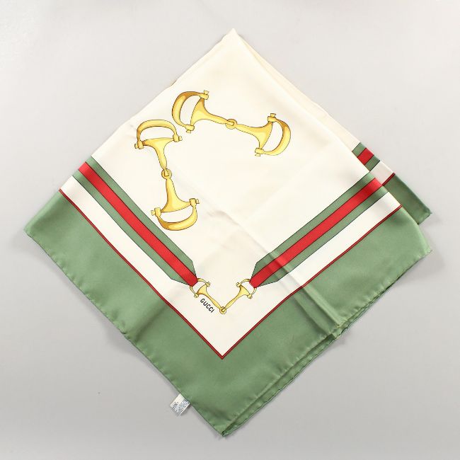 A GUCCI GREEN AND WHITE SILK SCARF, 32ins x 32ins.