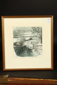 Alan Keeler (1923-2013) British, 'Sheepfold Little Langdale', an agricultural landscape, ink & wash, signed and inscribed, 8"x 7.5", with Dorothy E. Richardson, two figures with a donkey next to a windmill, watercolour, signed, 13.5" x 10.5". (2)