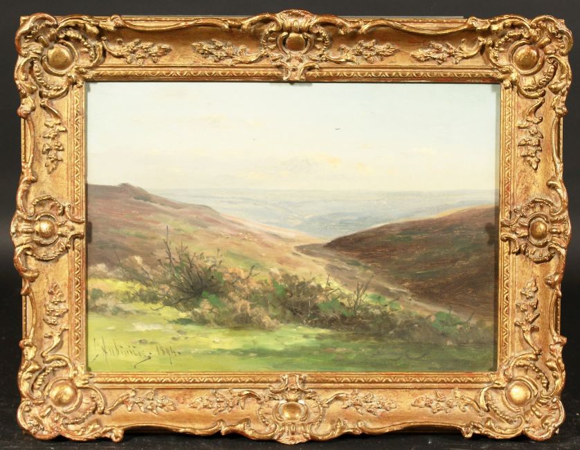 Georgina Martha de L'Aubiniere (1848-1930) British, A Country landscape with hills beyond, oil on canvas, signed and dated '1894', indistinctly inscribed Verso, 10" x 14".