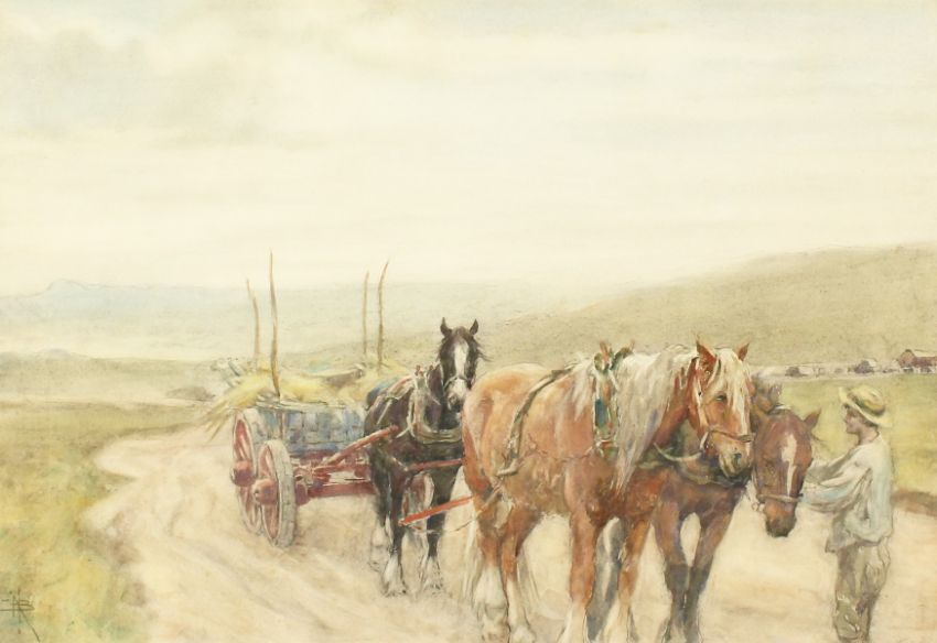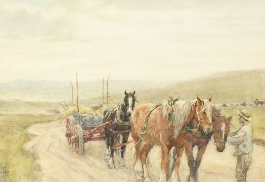 Nathaniel Hughes John Baird (1865-1936) British, A figure and horses on a country road, watercolour, signed with monogram, 15" x 22".