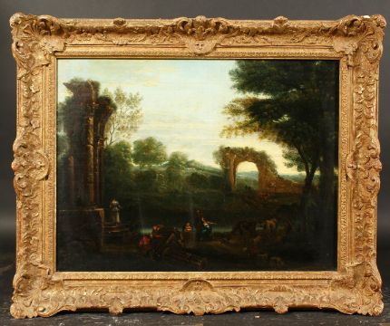 18th century Italian school, A scene of figures amongst Classical Ruins, oil on canvas, 15" x 20.5".
