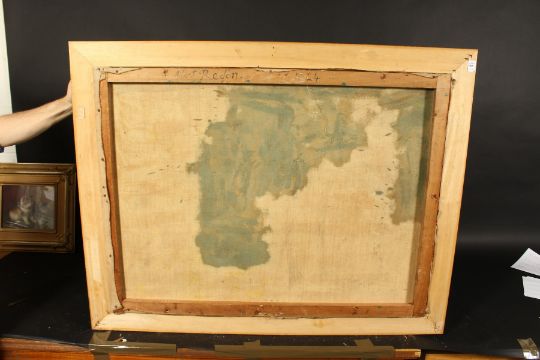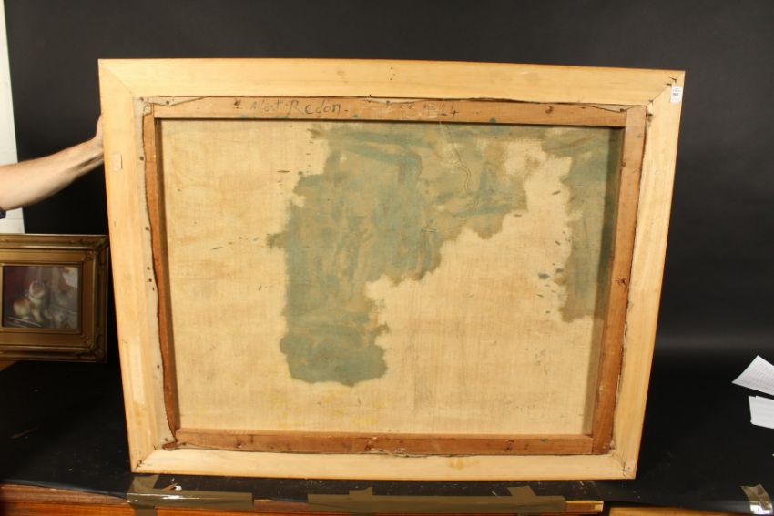 Albert Redon (20th century), A woman in a white dress walking on a shoreline, oil on canvas, signed and inscribed, 30" x 40".
