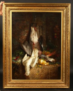 19th century school, A still life of dead game, fruit and vegetables, oil on canvas, 27" x 20".