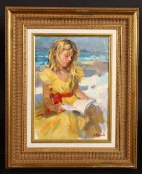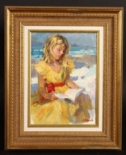 Alexei Biely (b.1927) Russian, 'Reading', signed oil on board, 13" x 9.5", 33x24cm.