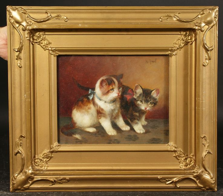 Josef Heimerl (1867-1918) Austrian, A pair of kittens in bows, and another similar painting by the same hand, oil on panel, signed, each 8" x 10". (2)