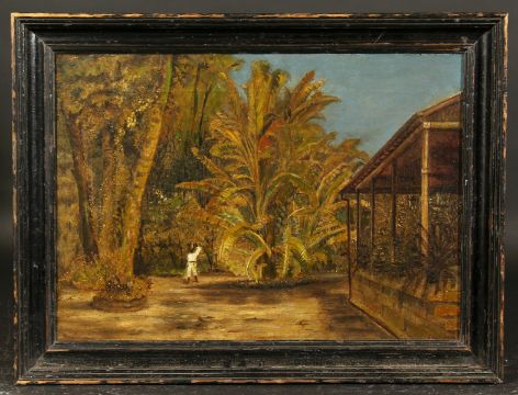19th century English colonial school, a scene of a figure walking within a banana plantation, oil on canvas, 14" x 19".