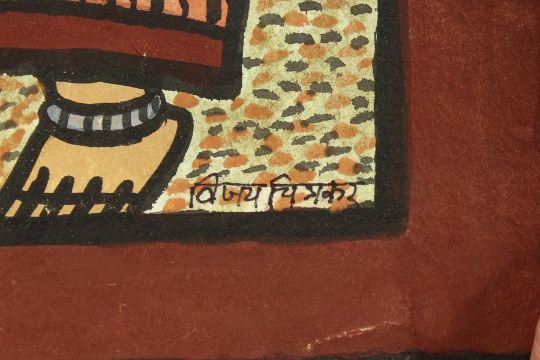 Vijay Chitraker (20th century) Indian, A scene of figures beneath the tree with a resting bird, signed, 22" x 30", Unframed.