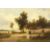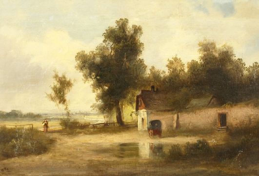 19th century, English school, Figures by a building in a rural landscape, oil on canvas, signed indistinctly with initials, 10" x 16".