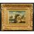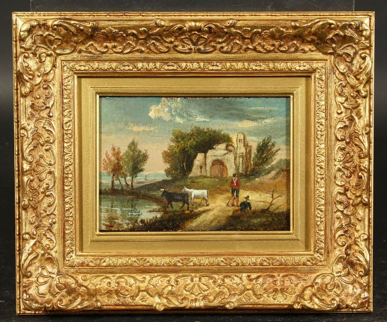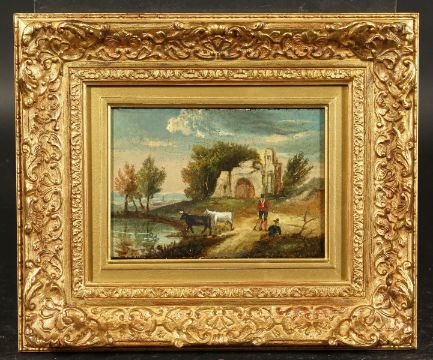 Early 19th century, A lakeside scene of two figures watering their cattle, with ruins in the background, oil on board, 5" x 7".