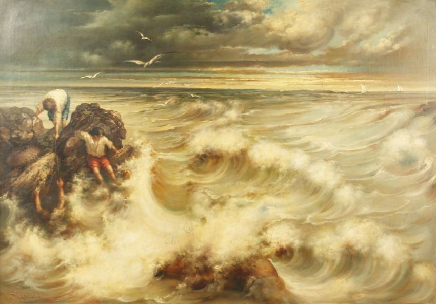 Sorjoresi (19th century) Continental, A coastal scene, with figures in distress on the rocks, oil on canvas, indistinctly signed, 39" x 56.5".