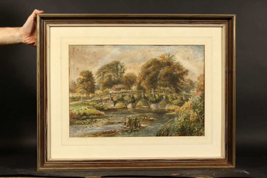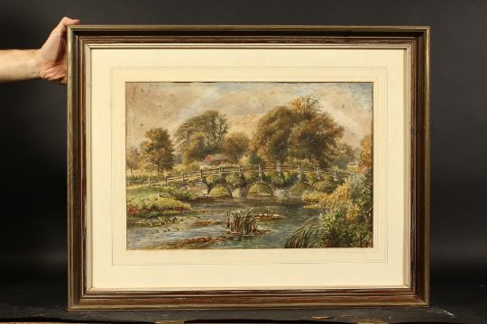 Louis Walter (19th century) British, Two views of Tilford Bridge and a view of Elstead bridge, three watercolours, each signed, 14" x 20", (3).