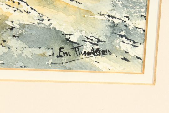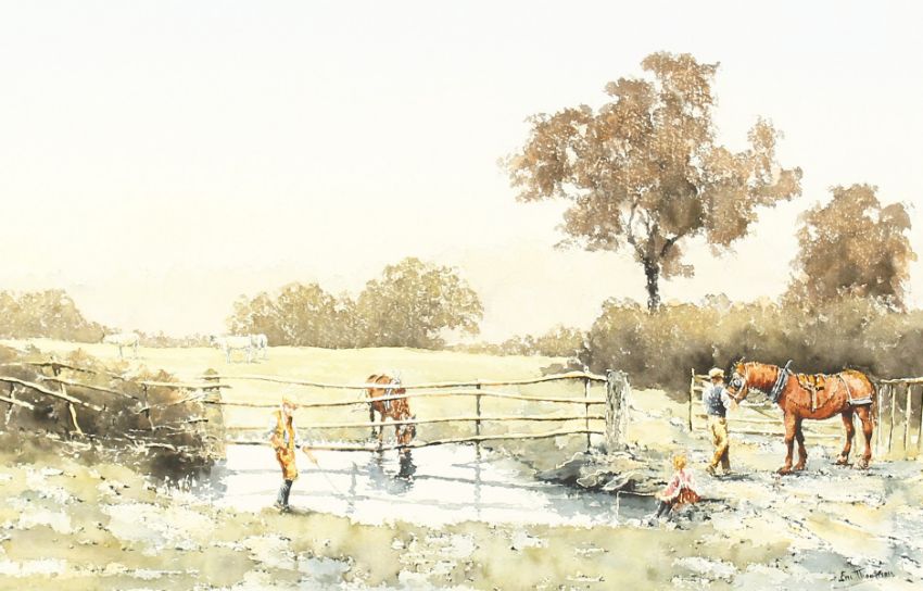 Eric Thompson, British, 'At the End of the Day', A scene with figures and horses, watercolour, signed, 14" x 21".