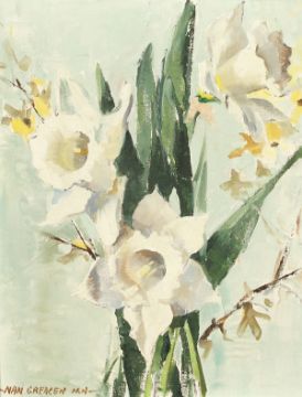 Nan Greacen (1908-1999) French, Two still life pictures of flowers, one pink roses, the other daffodils, oil on canvas, signed, both 9.5" x 7.5".
