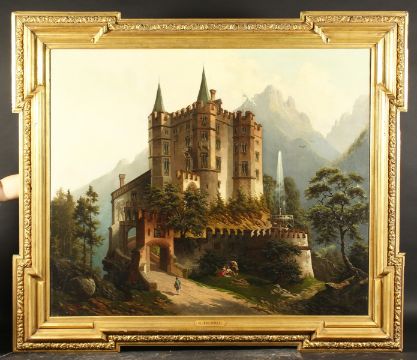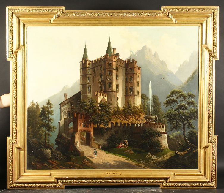 K. Herrle (19th century) Continental, A pair of scenes of castles in dramatic landscapes, oil on canvas, signed and dated '1887', each 43" x 51", (2)