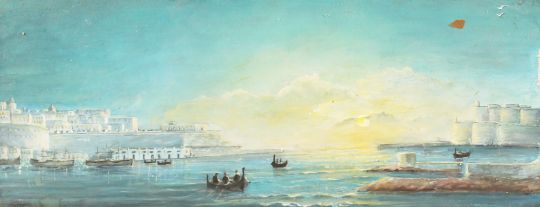 Early 20th century Maltese school, A view over Valletta harbour at sundown, gouache, 8" x 19.5".
